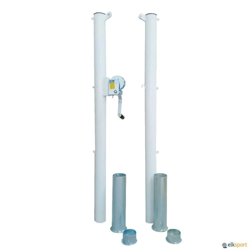 Postes de ferro: tubo de ferro pintado de secção redonda de Ø 80 mm. Tensão da rede por polia e manivela. Mangas de fixação e tampas incluídas.