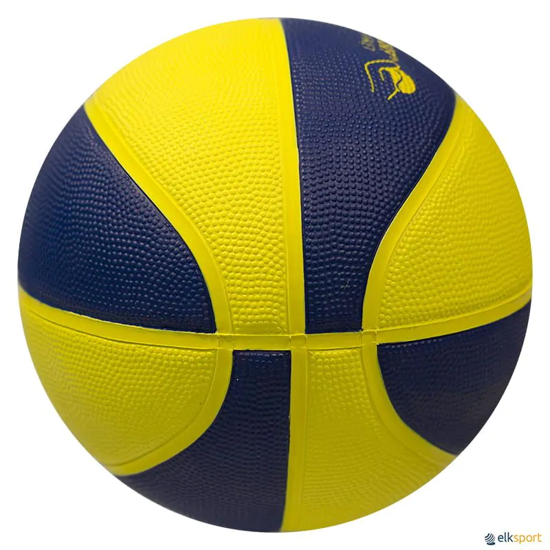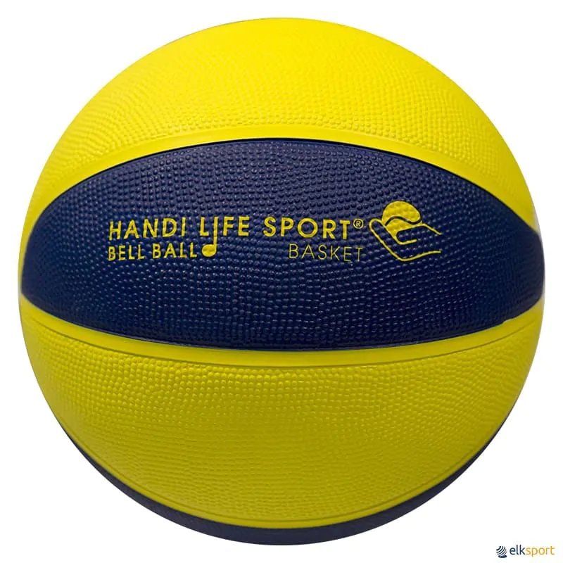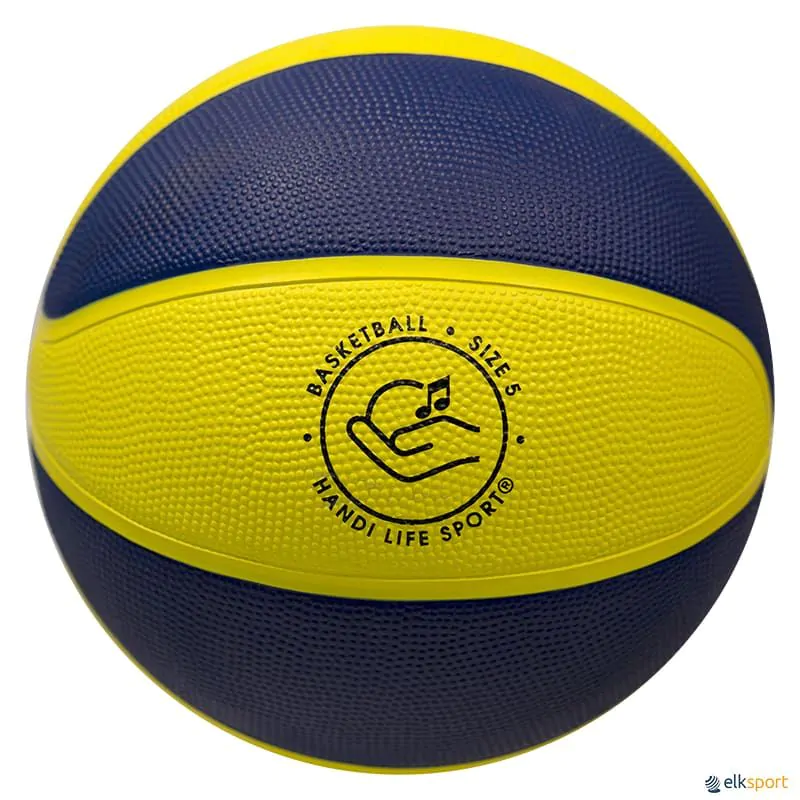 Bola de minibasquetebol de borracha da Handi Sport Life, nas cores azul e amarelo, com guizos de excelente som no seu interior.