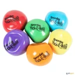 Bolas em PVC, maleáveis, cheias de pequenas bolas e um gel (não tóxico) cuja combinação, cria uma adaptação que oferece uma incrível sensação táctil na manipulação da bola.