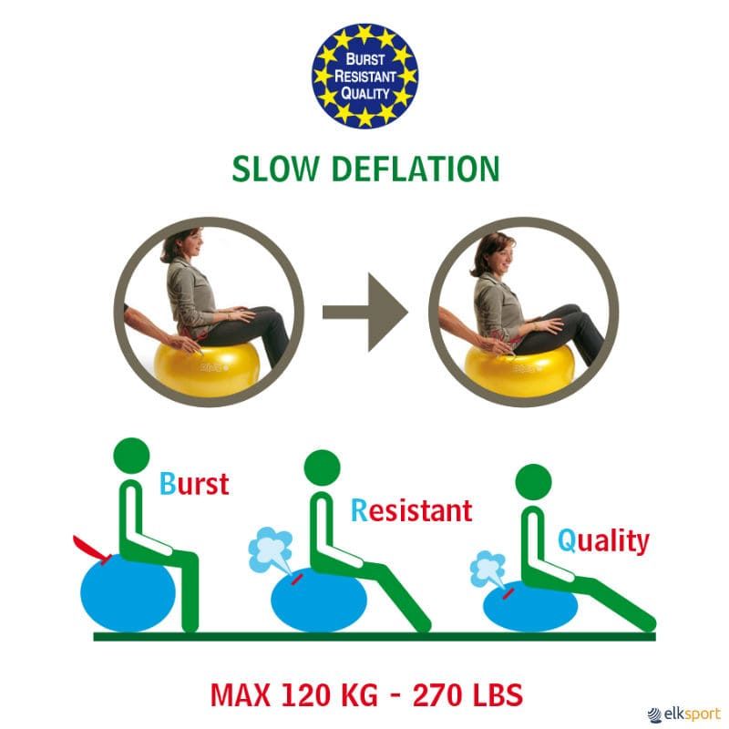 Bola gigante da Gymnic fabricada em vinil decorado, com um nível de flexibilidade semelhante ao das bolas gigantes, mas com o sistema BRQ anti-explosão — em caso de furo, a bola esvazia-se lentamente. Este sistema é eficaz com um peso máximo de 120 kg.