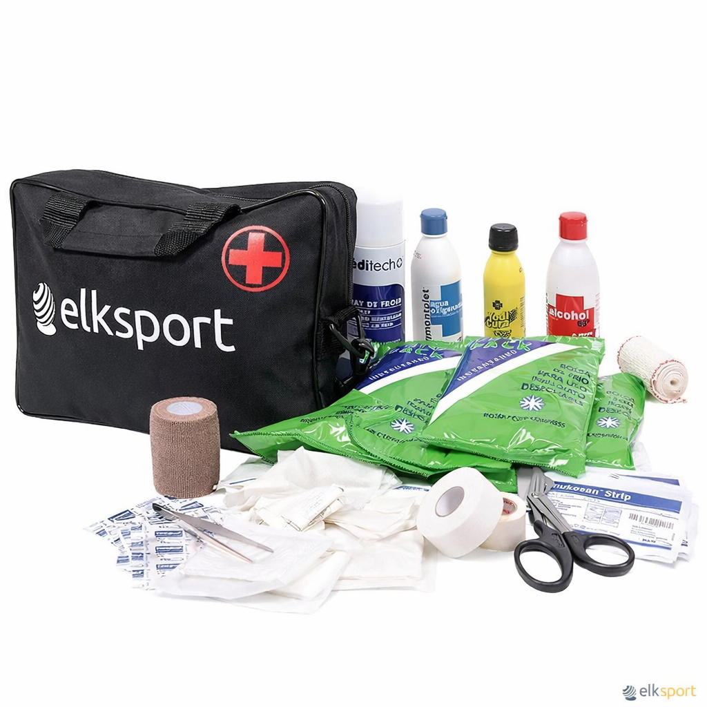 Bolsa vazia ou bolsa + Recheio Básico: 20 compressas esterilizadas. 1 garrafa de água oxigenada. 1 garrafa de álcool 96º 250cc. 1 garrafa de tintura iodo de 125cc. 1 tesoura curva universal. 1 adesivo de tela de 5 m x 2,5 cm. 4 suturas adesivas de 3 x 76 mm. 20 Pensos rápidos de 19 x 72 cm. 2 Rolo tape rápido 2,5 cm. x 10 m. 5 pares de luvas descartáveis. 3 bolsas de frio instantâneo. 1 spray de frio de 400 ml. 1 pinça 14 cm reta. 1 banda coesiva de 7,5 cm. x 4,5 m. 2 bandas elásticas de crepe 7 cm. x 4 m.