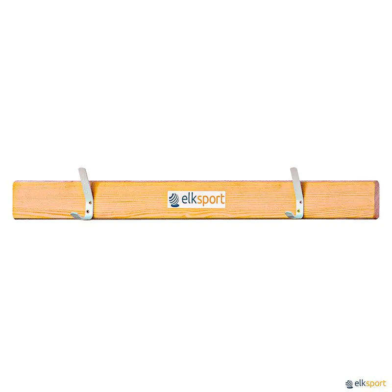 Cabide metálico esmaltado em branco, sobre tábua de pinho envernizada. 2 ganchos por cada metro. Preço ao metro linear.