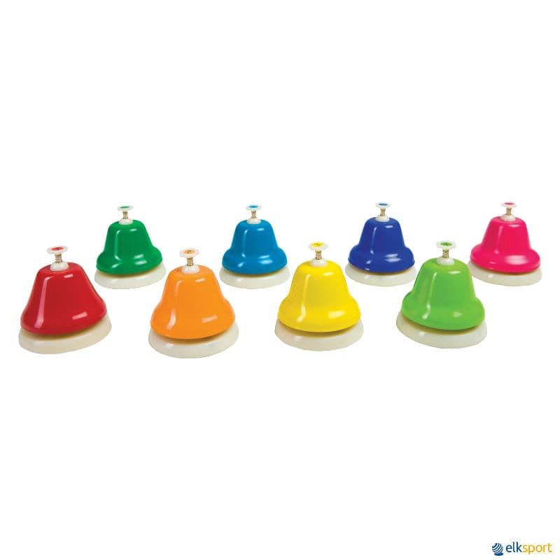 Conjunto de 8 campainhas musicais sem punho, perfeitamente afinadas. Escala diatónica. Inclui livrinho musical.