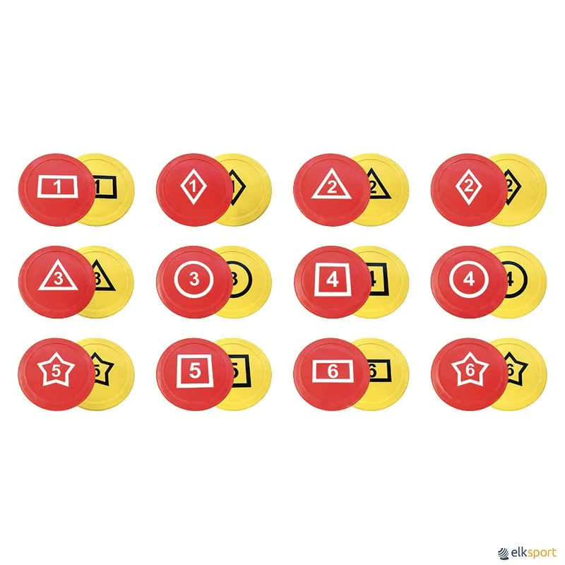 Este jogo é composto de 12 discos vermelhos e 12 amarelos, com um número e uma forma cada um. Permitem configurar o jogo Memória de Formas de diferentes maneira, como por exemplo: os discos estão com a face impressa para baixo, sem que se possa ver nem o numero nem a forma, o primeiro jogador levanta um disco e mostra à sua equipa e depois volta a esconder. Os outros jogadores tentam encontrar o par desse disco (por numero e forma). Cada jogador só pode levantar 1 ou 2 discos, mas se não encontra o mesmo numero ou forma deverá virar os dois. Ganha a equipa que encontrou os pares todos e os levou para o lado da sua equipa. Os recursos educativos deste jogo são muitos: oferece uma atividade de formas de uma maneira divertida, treina habilidades de memorização, de observação e de iniciação à orientação.