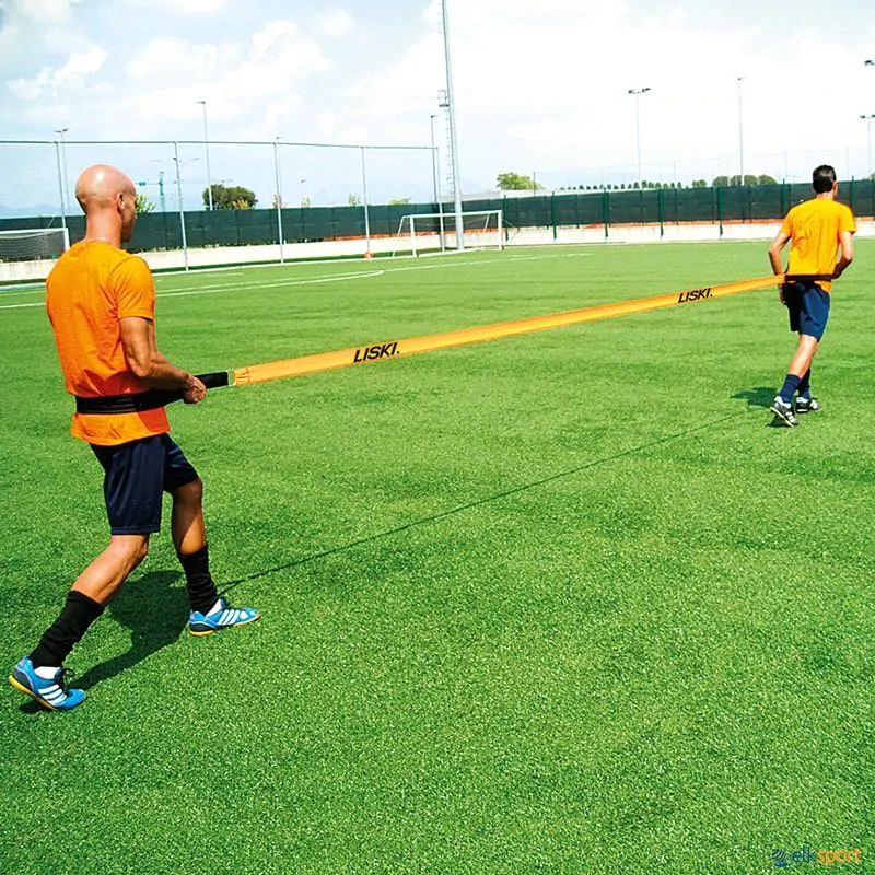 Elástico super resistente laranja fluorescente com 2 cintas em cada extremidade, que permite múltiplas utilizações para treinos de resistência ou de guarda-redes.
