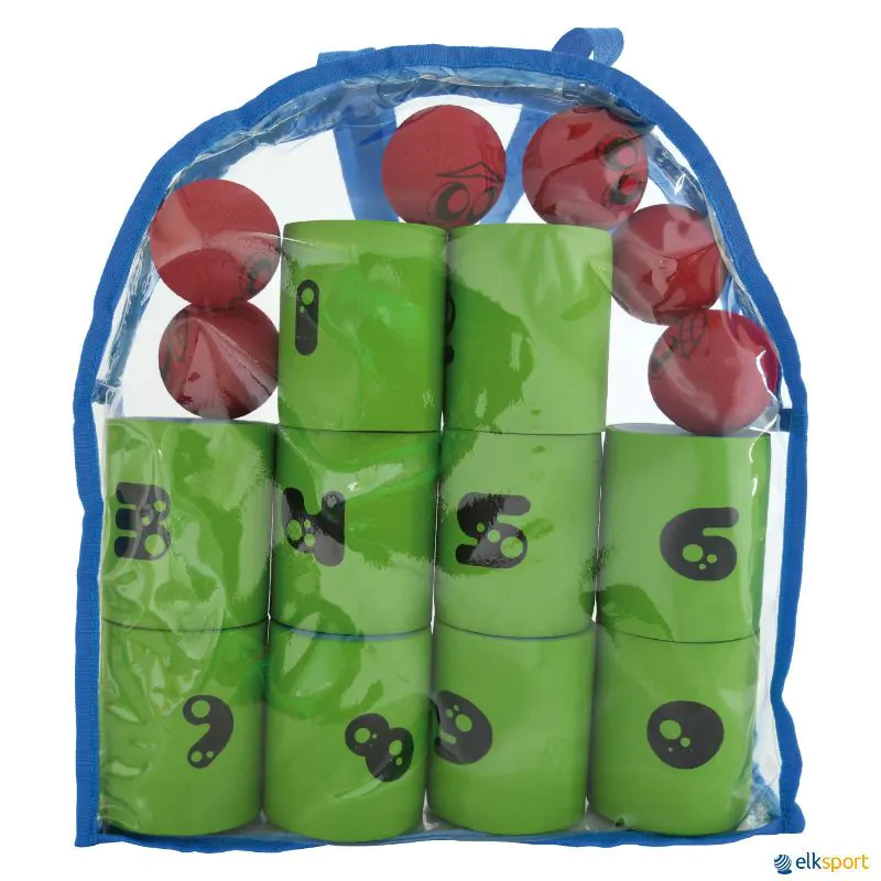 Jogo composto por: 4 bolas amarelas + 4 bolas violeta + 1 boliche vermelho e um saco para transportar/armazenar o jogo.