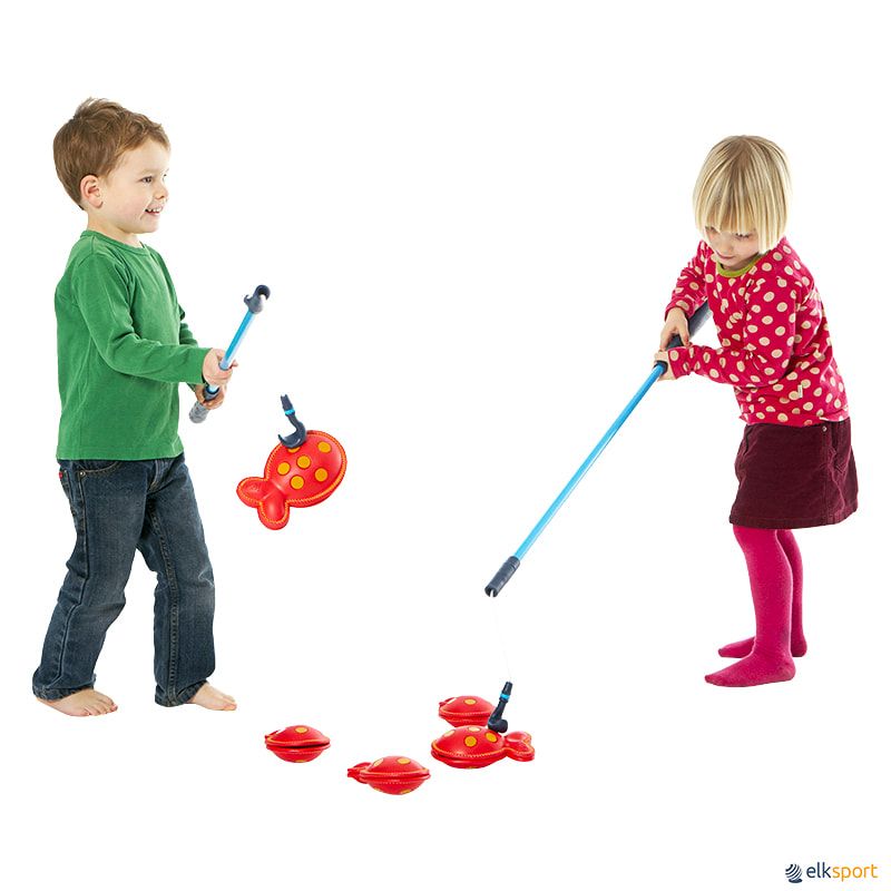 Com esta cana de pesca da marca Gonge, as crianças estão prontas para uma partida de pesca. O desejo de apanhar um peixe leva-as a desafiar a concentração e coordenação óculo-manual. Aproximar-se do peixe e colocá-lo no anzol para que possa ser pescado requer competências motoras e concentração mental. Dependendo do “peixe” a pescar, o “pescador” tem de usar o anzol ou o íman que este possui. Esta cana é adequada para ser utilizada como cana de pesca, mas também é possível “apanhar” muitos outros elementos no ambiente das crianças. A cana de pesca é muito versátil e pode ser utilizada em jogos imaginativos e de faz-de-conta que incluam interação e linguagem. Por exemplo, várias crianças podem também competir em “Quem apanha mais peixes sem cair à água?”.