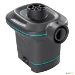 Compressor elétrico 220V pequeno, leve, fácil de transportar e utilizar. Carcaça de plástico. Inclui uma agulha de boca larga e 2 adaptadores de plástico. Manómetro integrado. Tempo médio para encher uma bola de basquetebol T7: 26 segundos.