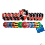 O conjunto de escudos inclui: 12 escudos, 12 bolas Dodgeball – Datchball e 1 saco ultraleve para armazenamento.