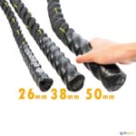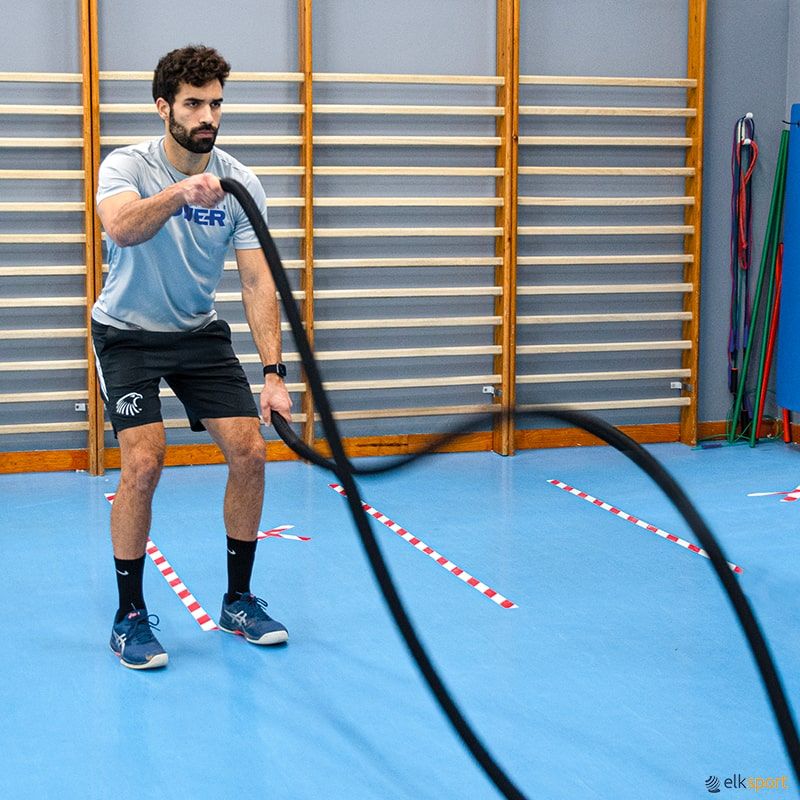 Corda de treino funcional fabricada em material sintético entrançado, muito durável, resistente à humidade e à abrasão, com fita protetora nas extremidades para evitar que se desfaça e oferecer uma melhor preensão.