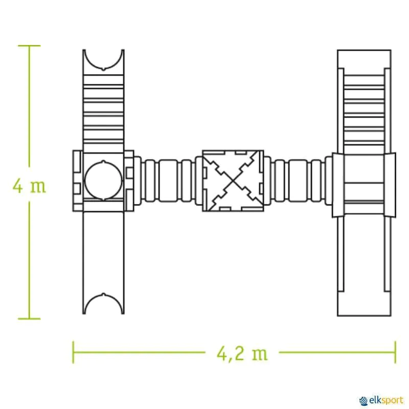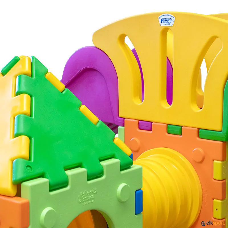 Cubic Toy H2000, constituído por: 14 Painéis do cubo, 2 Passadiços, 2 Túneis, 1 Escorrega grande, 1 Escada grande, 2 Protetores Laterais, 4 Placas triangulares, 2 Escorregas, 1 Secção superior do cubo. Espaço necessário : 4,20 x 4 m.