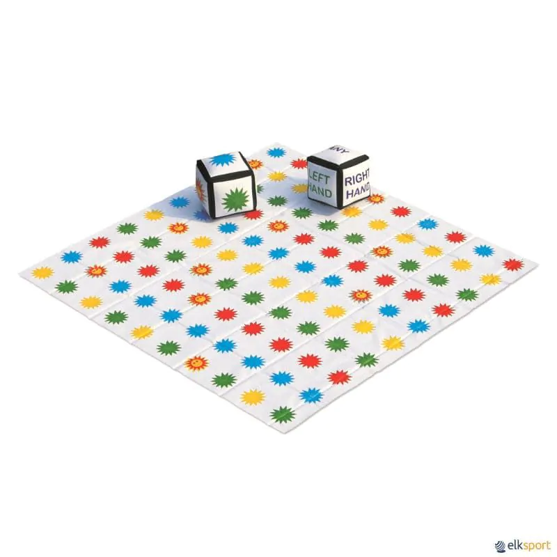 Permite jogos de destreza e mobilidade ao respeitar as instruções coloridas dos dados (escritos em inglês).