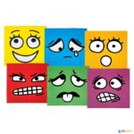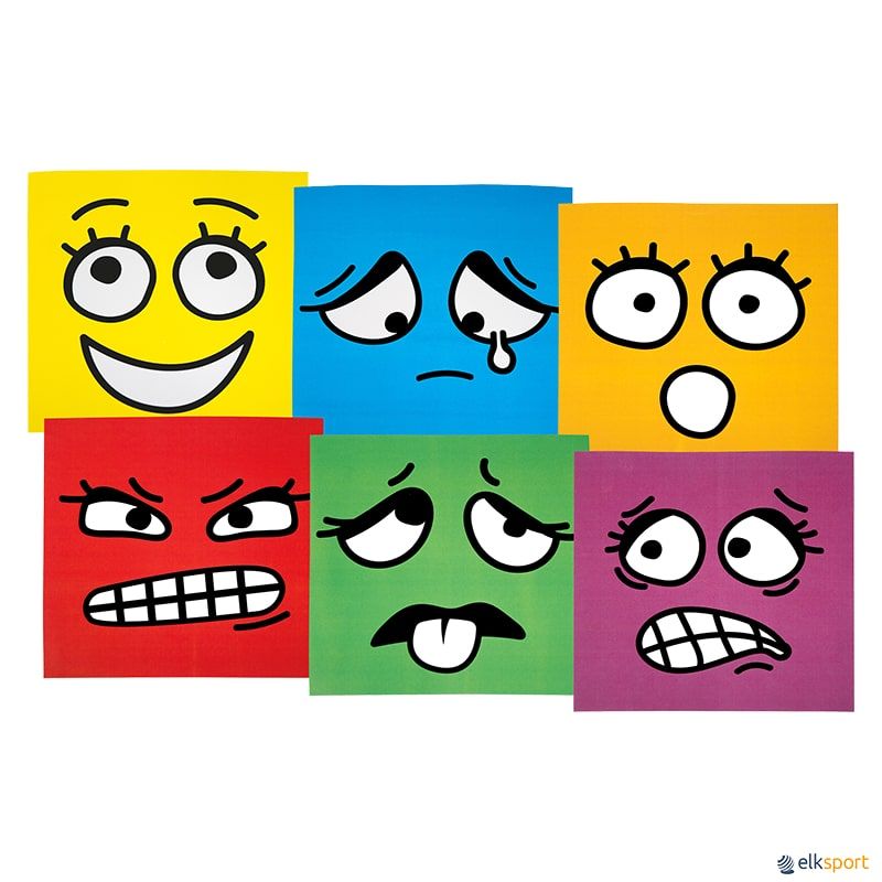 Conjunto: Um dado com 6 faces de cores diferentes e 6 cartões com caras que representam as emoções.