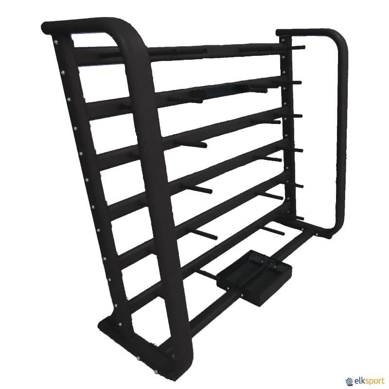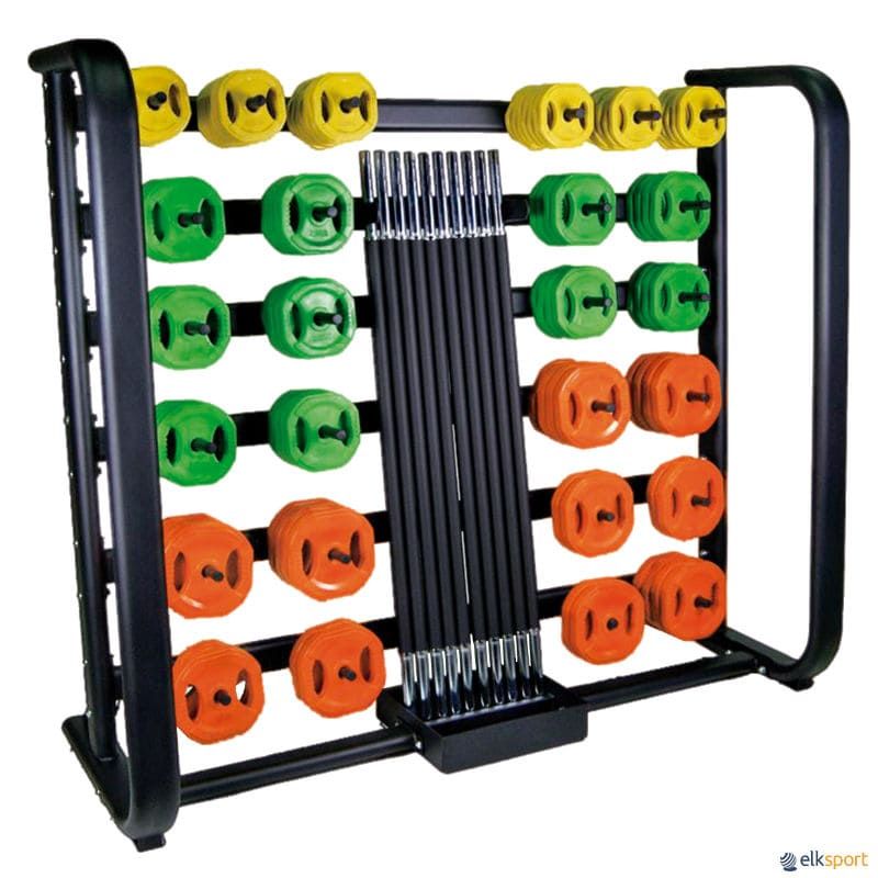 Móvel para armazenar conjuntos de barras e discos Body Pump, compatível com discos de 30 mm de diâmetro. Fabricado em aço de alta resistência com suportes revestidos a plástico para não danificar os pesos.