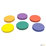 O conjunto é formado por: 6 discos em 6 cores (amarelo, azul, laranja, vermelho, verde e violeta).