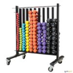 Móvel para armazenar halteres de aço, com rodas para facilitar o seu transporte.