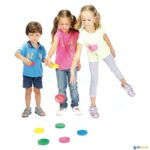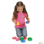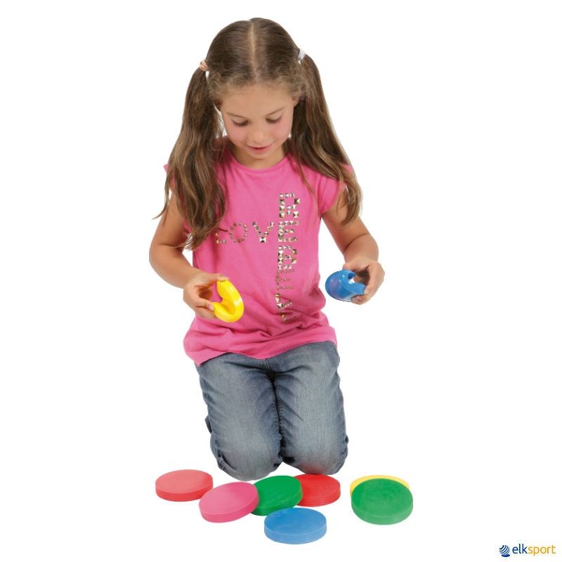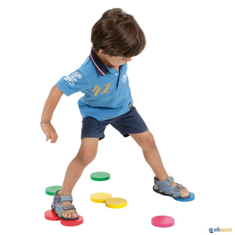 conjunto de 9 fichas ou discos de borracha permitem criar vários jogos lançamento, habilidades motoras (podem ser pisadas e caminhar sobre elas) e também contribuem para o desenvolvimento sensorial da criança.