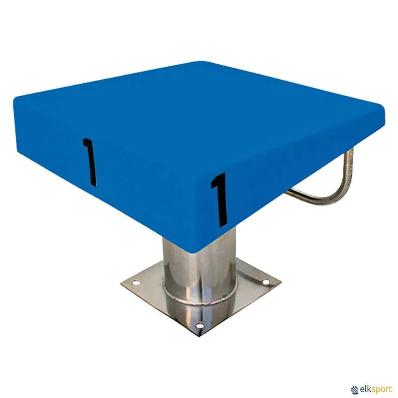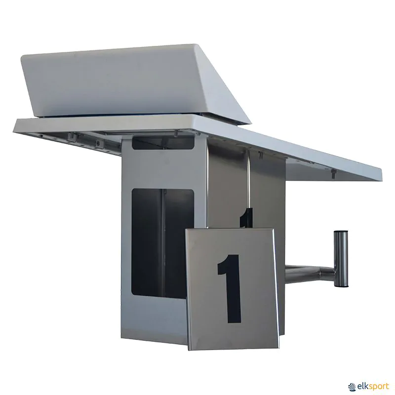 Fabricado em aço inoxidável AISI-316 electropolido. Plataforma em fibra de vidro antiderrapante, com dispositivo de apoio regulável em 5 posições diferentes. Sistema de abertura traseira para colocação do altifalante de cronometragem eletrónica no seu interior. Numeração nos 4 lados. Fixação oculta.