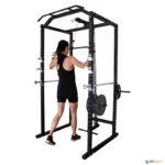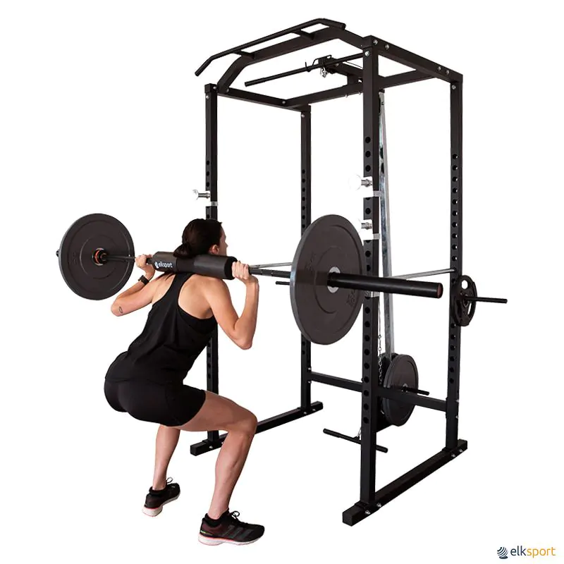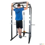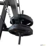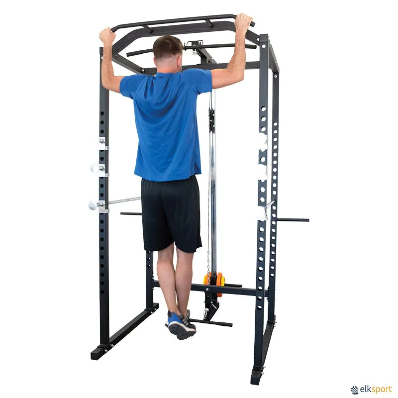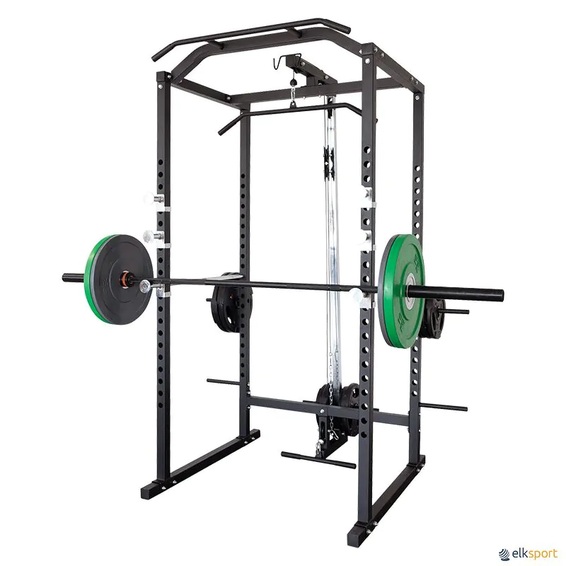 Este pequeno ginásio permite treinos com pesos livres, com suportes de halteres com ampla variedade de possibilidades de ajuste e uma barra de pull-up na frente. Também possui um sistema de polias superior e inferior para um treino versátil. Inclui 4 suportes para guardar discos de ø interno de 28 mm. Discos e barra olímpica não incluídos.