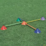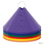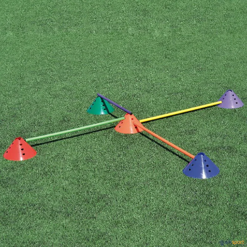 Jogo de 24 cones em plástico flexível de 15 cm de altura e Ø 30 cm. Com recorte para apoio de bastão no topo e mais 12 orifícios laterais, em 3 alturas, que permitem pousar um bastão. Ao serem atingidos durante o exercício, os bastões caem ao chão, evitando assim quedas ou tropeções dos atletas.