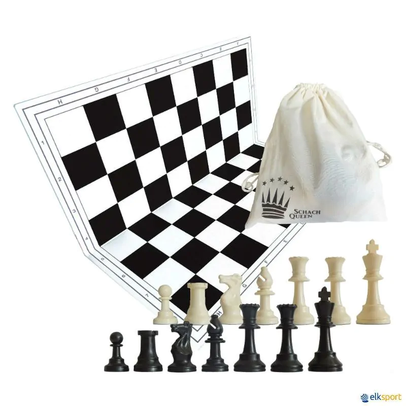 Conjunto de xadrez, com tabuleiro dobrável e muito resistente, com peças de plástico em bolsa de tecido.
