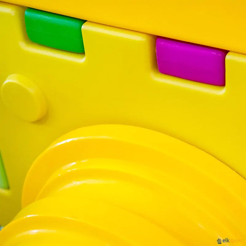 Cubic Toy H2000, constituído por: 14 Painéis do cubo, 2 Passadiços, 2 Túneis, 1 Escorrega grande, 1 Escada grande, 2 Protetores Laterais, 4 Placas triangulares, 2 Escorregas, 1 Secção superior do cubo. Espaço necessário : 4,20 x 4 m.