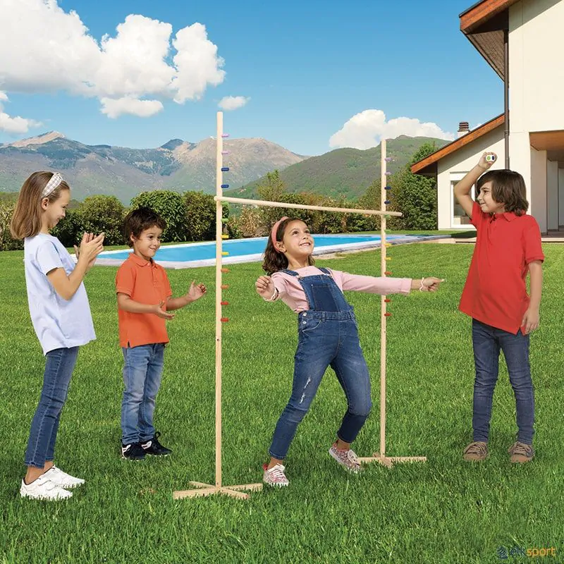 Jogo tradicional que consiste em passar por baixo de um pau colocado entre 2 postes, que se vai baixando aos poucos. Jogo em madeira. Incluí um dado colorido de 3 cm de lado.