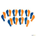 Jogo dos pés composto por: 10 pares pés, sendo os direitos de cor laranja e os esquerdos de cor azul. Sistema de apoio para orientar os conceitos de direções, movimentos e deslocações das diferentes partes do corpo, assim como para melhorar diversas capacidades básicas. A superfície posterior tem uma textura rugosa que permite manter cada componente no seu lugar.