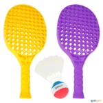 Este jogo resolve os problemas do jogo de badminton ao ar livre, assim como os problemas com as cordas das raquetes. A raquete é de plástico muito robusto. O volante associado também pode ser jogado com as mãos. Não é recomendável o uso das bolas de ténis com estas raquetes, nem bater na saia do volante com a raquete, por riscos de a danificar. Vendida á unidade ou lote 6 raquetes em 6 cores.