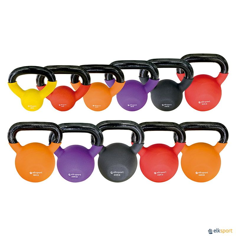 Kettlebells fabricadas em ferro revestido a neopreno, um material agradável ao toque, muito confortável e bastante duradouro. Cada peso tem uma cor distinta, o que facilita a escolha da kettlebell durante a aula.