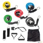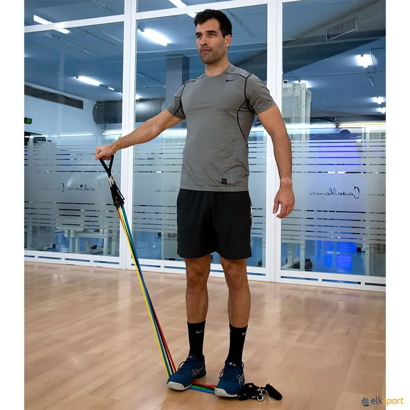Kit composto por: 5 elásticos de 120 cm com mosquetão em 5 densidades (Ligeira, média, forte, super forte e Extra forte), 2 braceletes acolchoadas, 2 pegas para elásticos, 1 ancoragem de porta e bolsa de transporte.