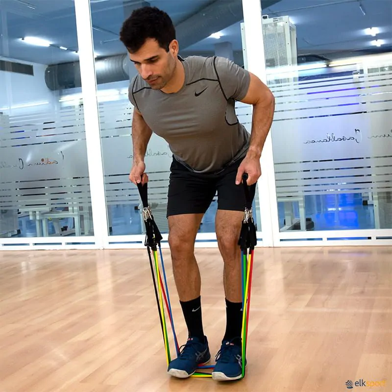 Pode-se regular a intensidade do exercício incrementando ou retirando elásticos nas pegas.