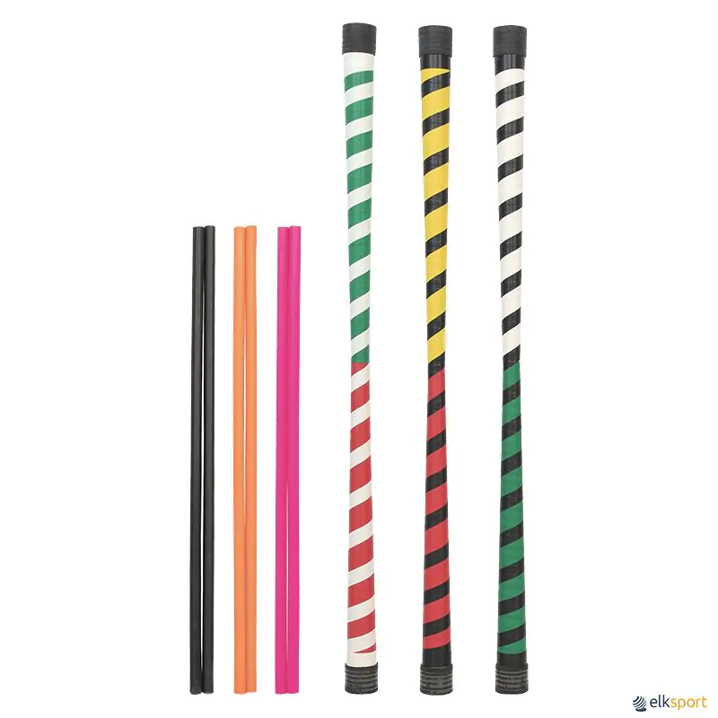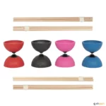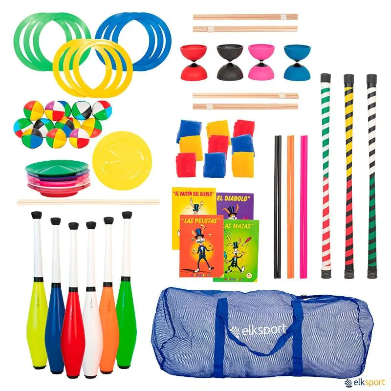 Kit de malabarismo de iniciação, para atividades com até 25 alunos, composto de: 3 Conjuntos de 3 lenços – 12 Bolas de malabarismo – 6 Pratos chineses + 6 sticks madeira para os pratos chineses – 4 Diabolos Rubber King – 3 Bastões de Malabar fantasia – 6 Maças Flip – 3 Conjuntos de 3 anéis malabarismo 32 cm – 1 Saco para armazenar – 4 Livretes de malabarismo.