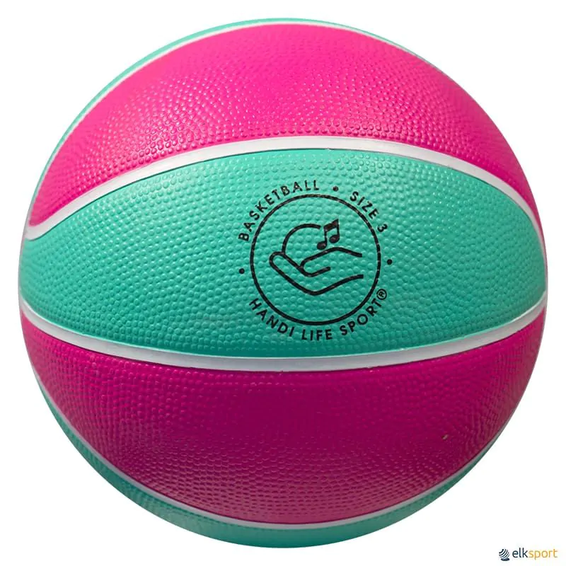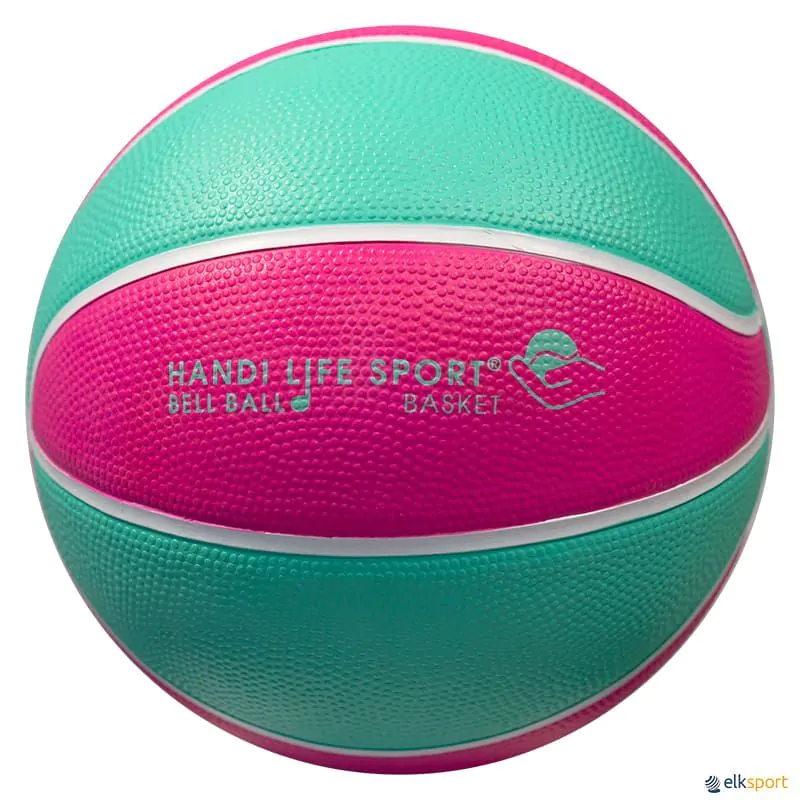 Bola de microbasquetebol de borracha da Handi Sport Life, nas cores rosa e turquesa, com guizos de excelente som no seu interior.
