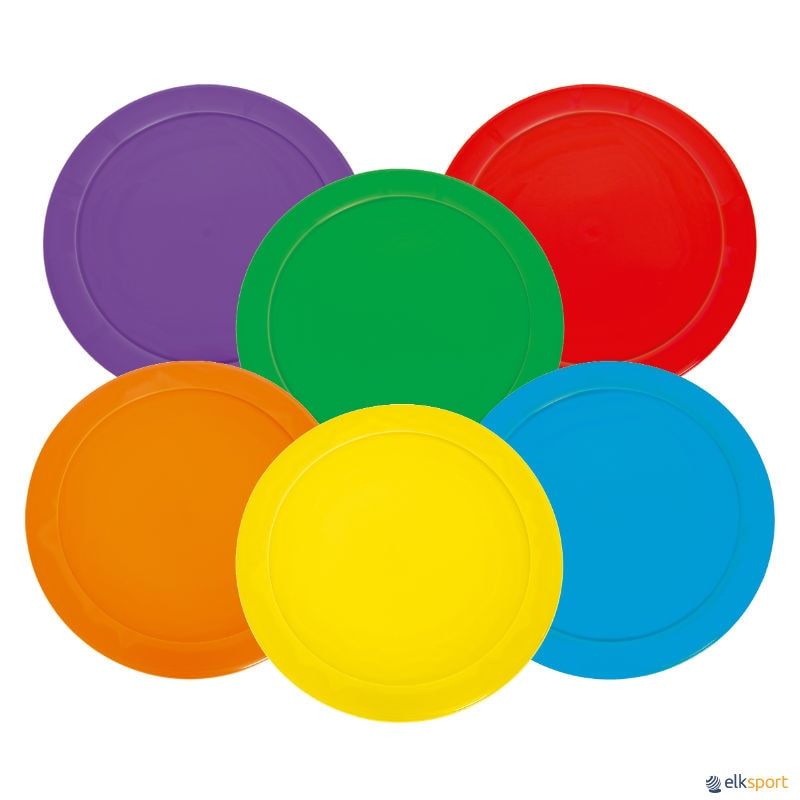 O instrumento ideal para aprendizagem do gesto, movimento e colocação ! Estes discos versáteis úteis por exemplo para o treino de salto em altura ou para táticas de jogo em desportos coletivos. Antiderrapantes tanto no interior como no exterior. Lote de 6 marcas, em 6 cores: vermelho, amarelo, verde, azul, laranja e violeta. Diâmetro: 22 cm.