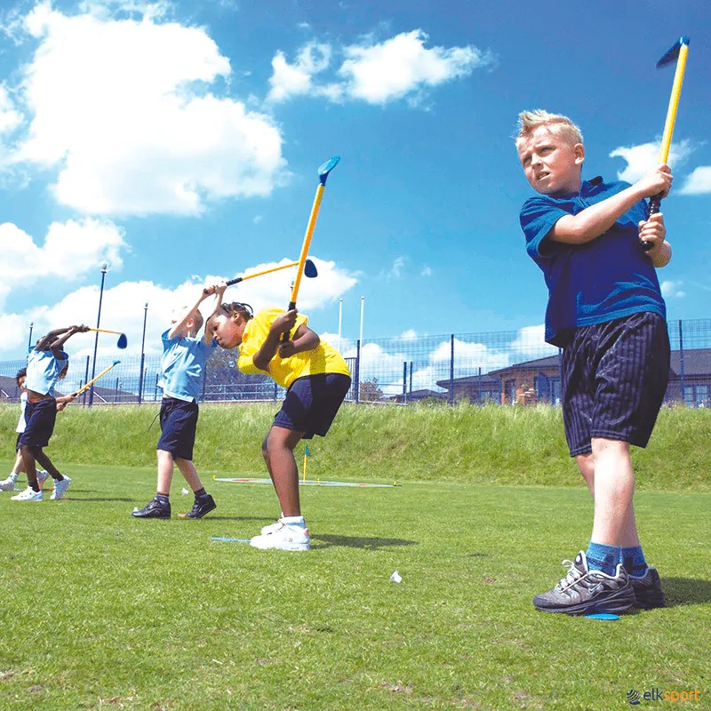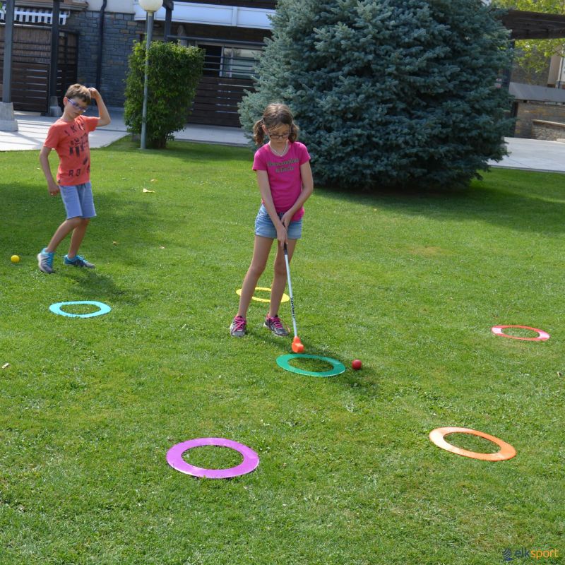Trigolf é um jogo para interior ou exterior que pode ser jogado em espaços grandes ou pequenos. Os tacos de plástico e as bolas de espuma servem perfeitamente para a iniciação ao golfe. O Trigolf e também ideal para alunos com necessidades educativas especiais. Fichas de atividades: O conjunto inclui fichas com ideias para iniciação ao golfe, jogos divertidos, e com adaptações para alunos com necessidades especiais, para que todos participem.