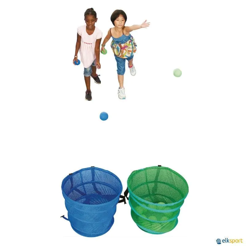 O conjunto inclui: 2 cestas e 10 bolas por cesta. Cores: azul e verde.