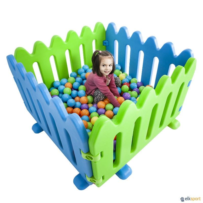 Piscina de bolas fabricada em espuma de 25 kg e revestida com PVC poliéster. Composta por 1 tapete de base e 4 blocos unidos entre si através de um sistema reforçado de velcros, formando um conjunto muito sólido e indeformável.