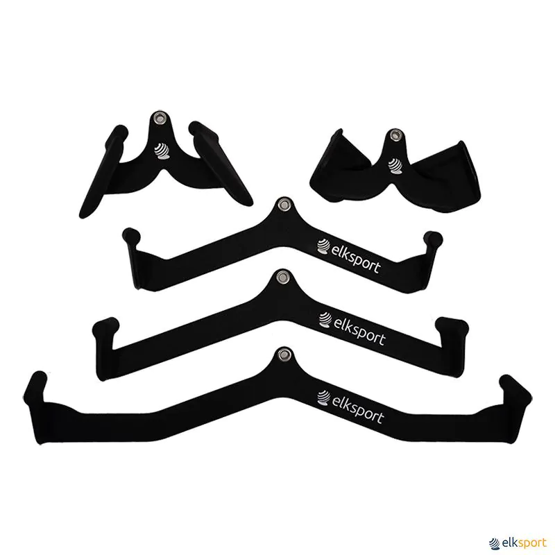Conjunto de 5 pegas confortáveis e perfeitas para os exercícios de puxada dos utilizadores. Dispõem de asas de tração especialmente concebidas para se adaptarem perfeitamente às mãos, bem como de um design ergonómico que proporciona uma pega confortável e natural. A sua forma ligeiramente curvada e a variedade de pegas que o kit oferece permitem uma melhor concentração durante a execução dos exercícios.