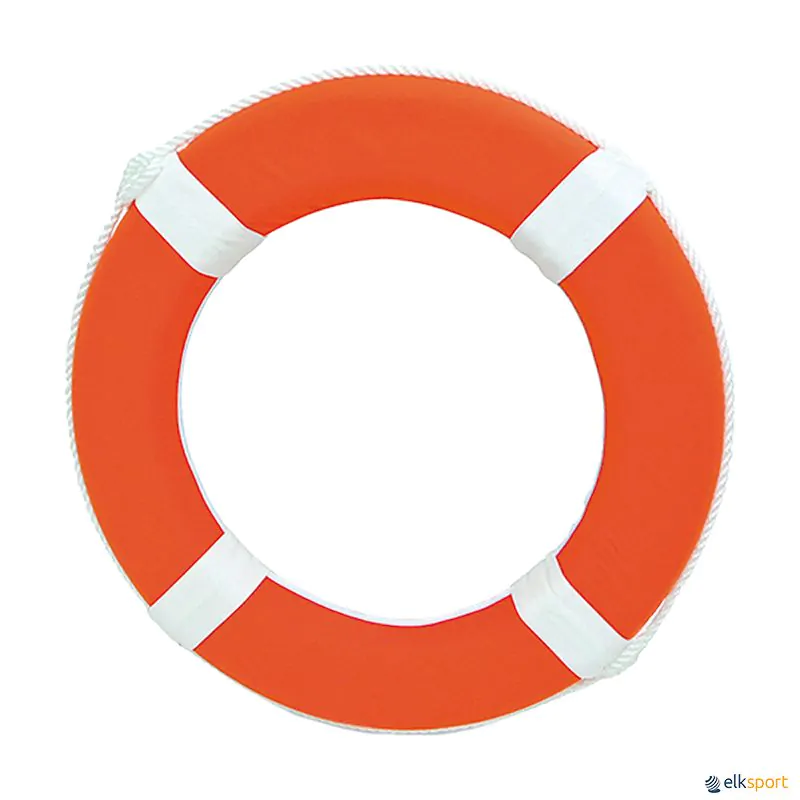 Boia salva-vidas em polistireno macio e leve, revestida de nylon laranja com bandas refletoras e cordas de poliéster.
