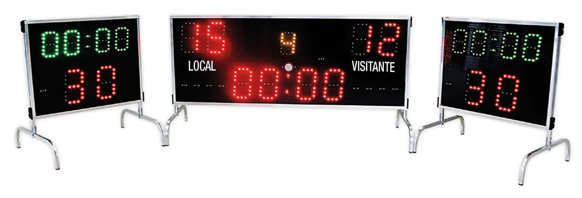 Dígitos com 18 cm de altura e comunicação por radio-controle. Contagem progressiva ou regressiva, tempo técnico, buzina automática e contador de períodos. Inclui 2 marcadores de 20/30 segundos. Transformador de 12V / 5A CC.
