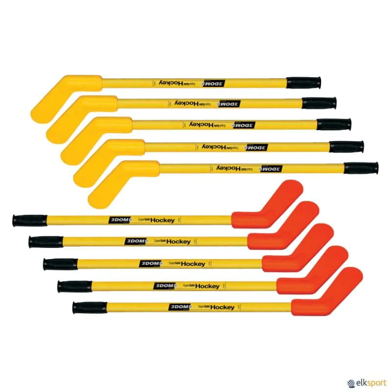 O jogo de hóquei super suave (SS) é composto por: 10 sticks SS (5 amarelos + 5 azuis), 1 bola de espuma e 1 disco de espuma.