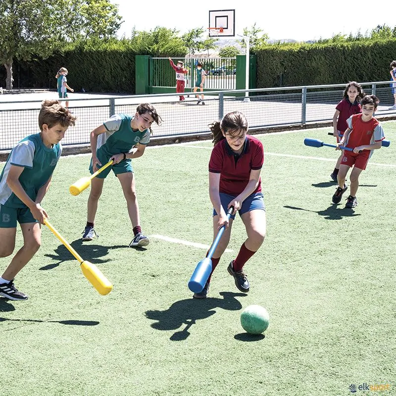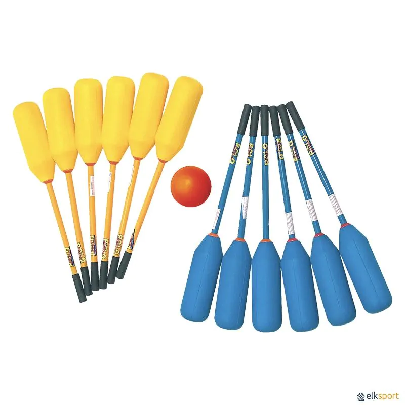Jogo de Mazaball completo: 12 maças SS com base flexível (6 amarelas + 6 azuis) e 1 bola em espuma.