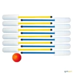 Jogo completo: 12 maças com base flexível (6 amarelas e 6 azuis) e 1 bola de espuma 16 cm de Ø.