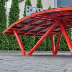 Pernas em aço curvado, fixadas ao chão com parafusos.