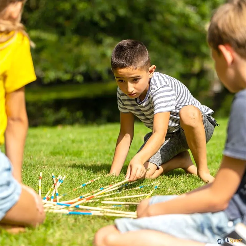 O jogo é composto por 26 palitos de bambu diâmetro 0,8 cm – Comprimento 90 cm. O seu tamanho gigante permite jogar no chão, sobre superfície lisa.