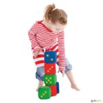 Dado fabricado em espuma e revestido com vinil de grande resistência, proporcionando muita diversão, elevada versatilidade e participação ativa. Cada face do dado possui uma janela de vinil transparente que funciona como bolso, permitindo inserir cartões (até 10 x 15 cm) com instruções específicas de movimento ou atividade. Cartões não incluídos.