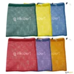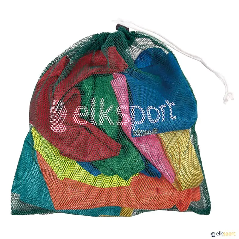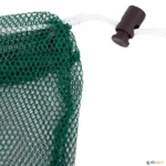 Confecionado em malha de poliéster, que permite ver e arejar o conteúdo, e cordão com mola de aperto. Lavável.