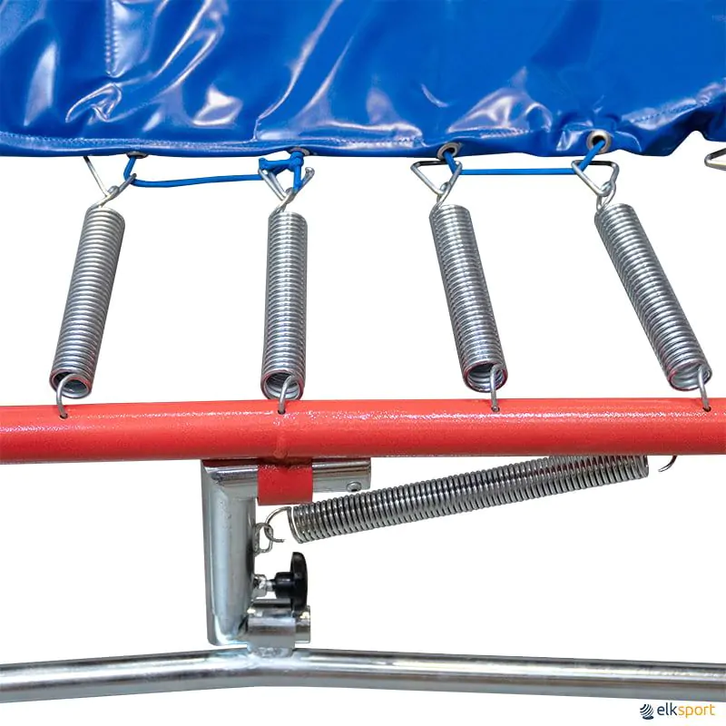Trampolim Reuther com base anti deslizante com pés em borracha. Piso em alcatifa com uma marca indicativa da chamada.