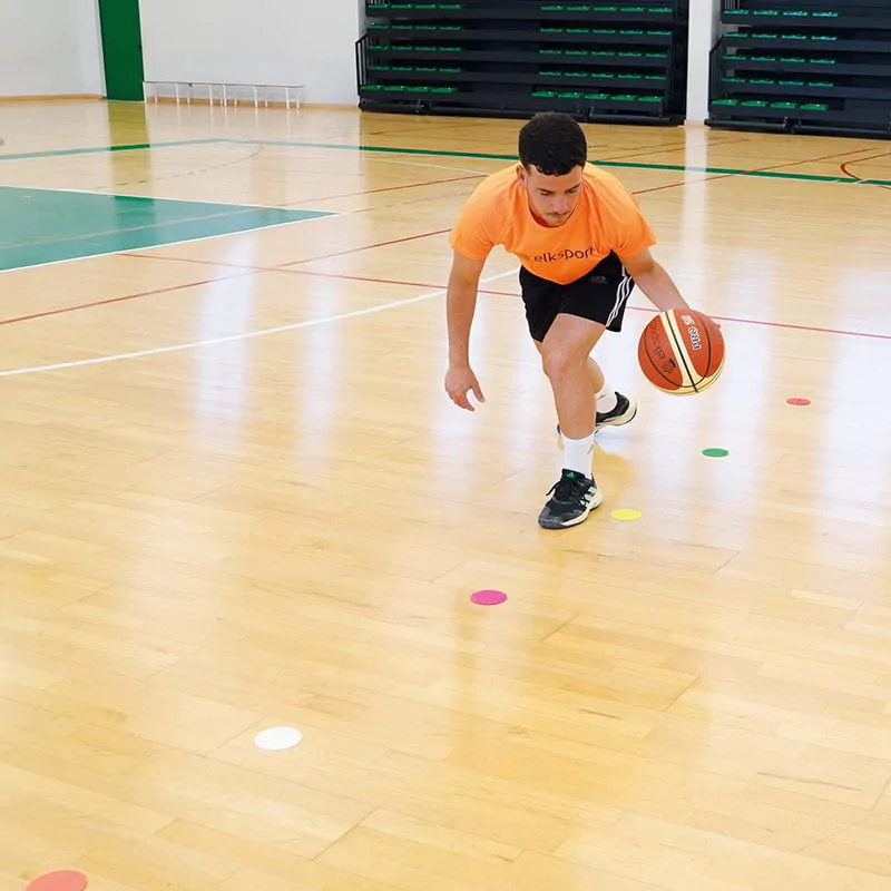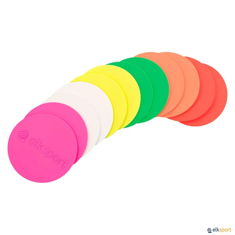 O instrumento ideal para aprendizagem do gesto, movimento e colocação ! Estes discos versáteis úteis por exemplo para o treino de salto em altura ou para táticas de jogo em desportos coletivos. Antiderrapantes tanto no interior como no exterior. Lote de 6 marcas, em 6 cores: vermelho, amarelo, verde, azul, laranja e violeta. Diâmetro: 22 cm.